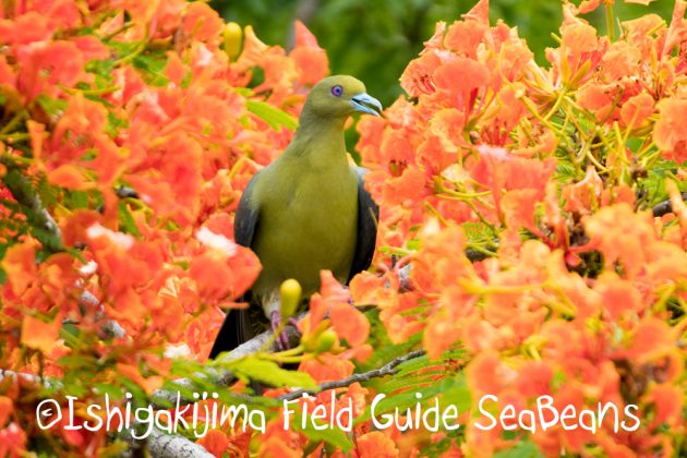 鳳凰木の花の中にチュウダイズアカアオバト!!