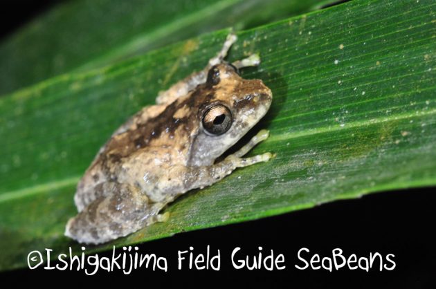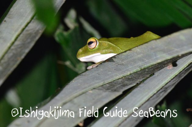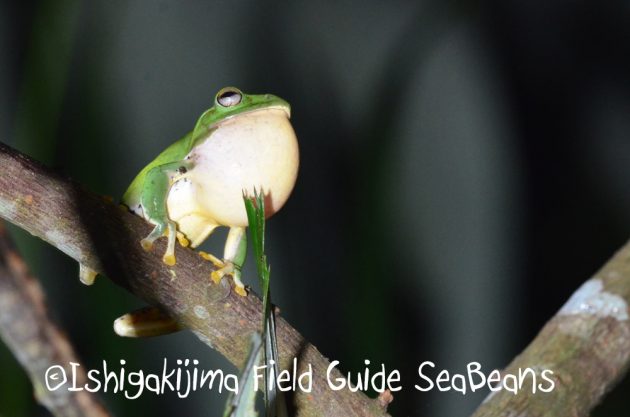明かりを照らしても鳴き続けるヤエヤマアオガエル。