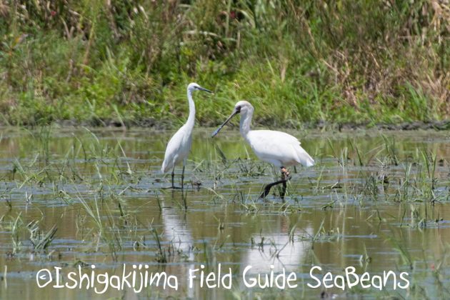 コサギとクロツラヘラサギ。