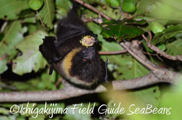 モモタマナの実を食べるヤエヤマオオコウモリ。