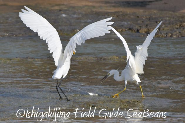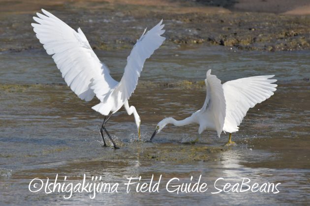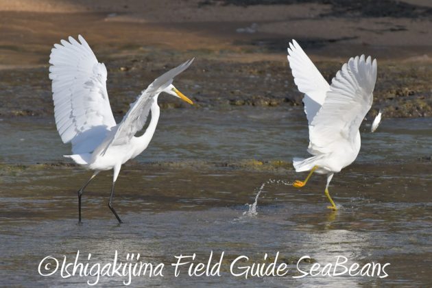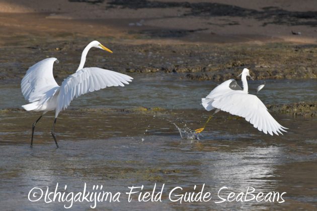 ダイサギが小魚を落としたら、ここぞとばかりに奪いに入ったクロサギ。