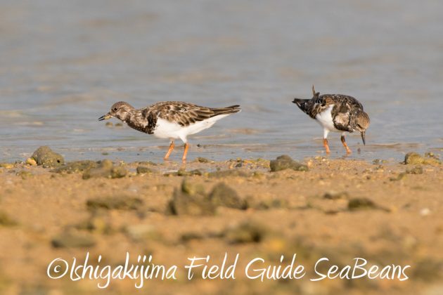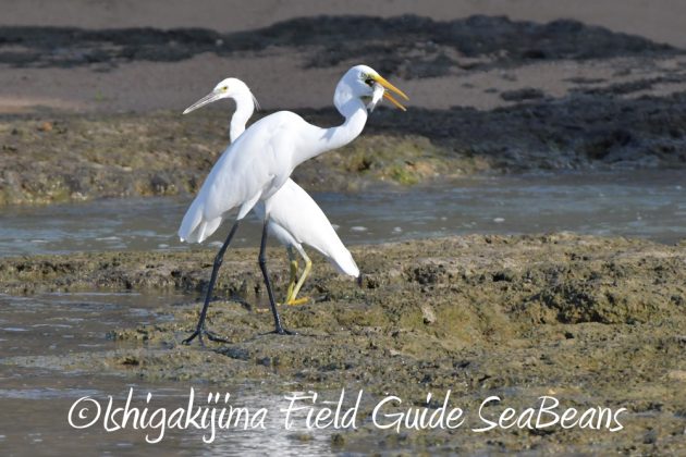海岸でダイサギが小魚を捕獲、もの欲しそうに見つめるクロサギ白色型。