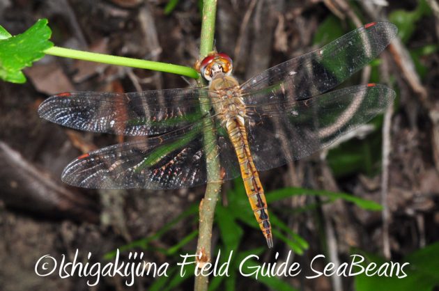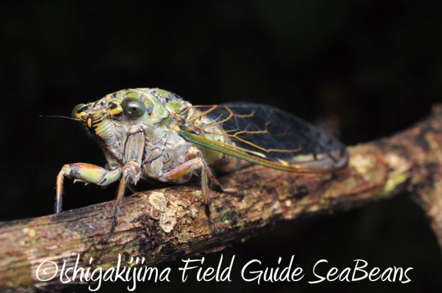 強風の影響でしょうか?低い枝に止まって休んでいるイワサキゼミ数匹を観察。