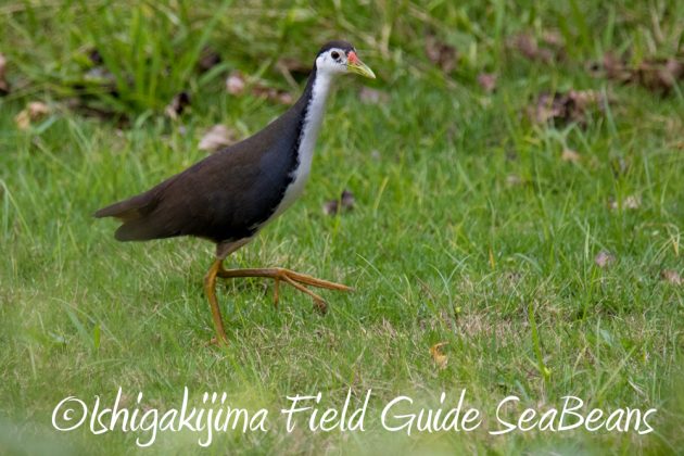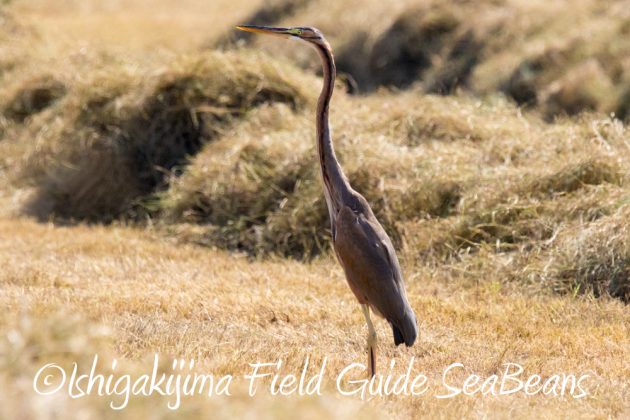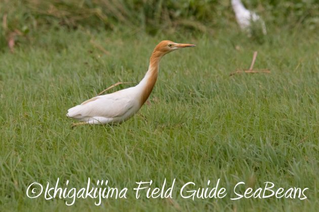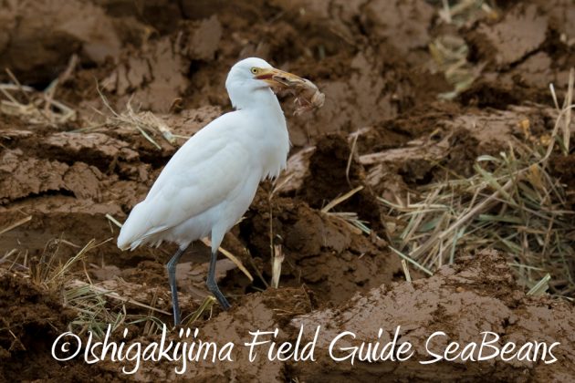 外来生物のシロアゴガエルを捕獲したアマサギ。