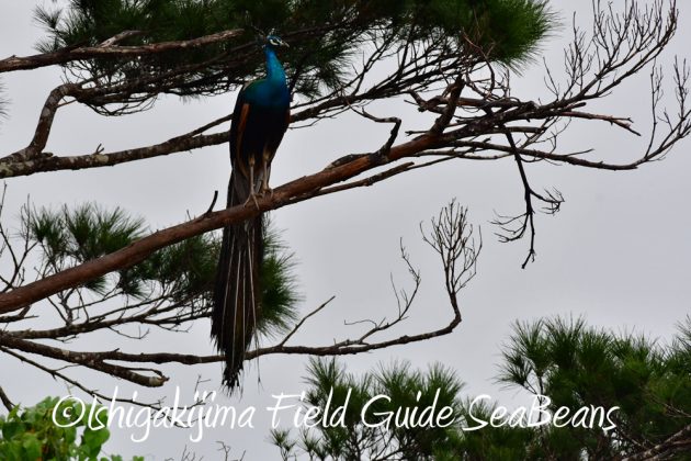 美しいインドクジャク雄がリュウキュウマツの枝に止まって居ました。