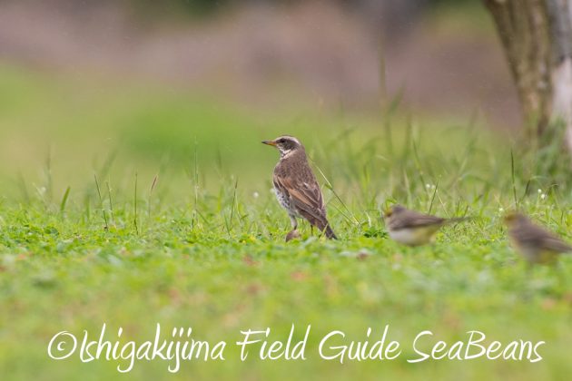 群れの中に1羽だけツグミ。