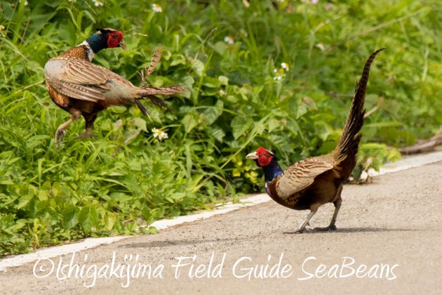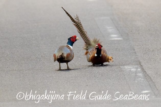 路上でコウライキジ2羽がもめていました。