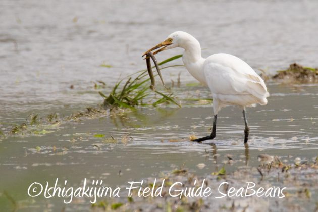 タウナギを捕獲したアマサギ。