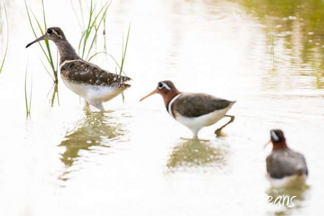 タマシギ雄の後を付き纏うタマシギ雌たち。