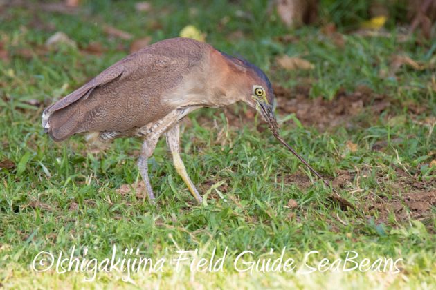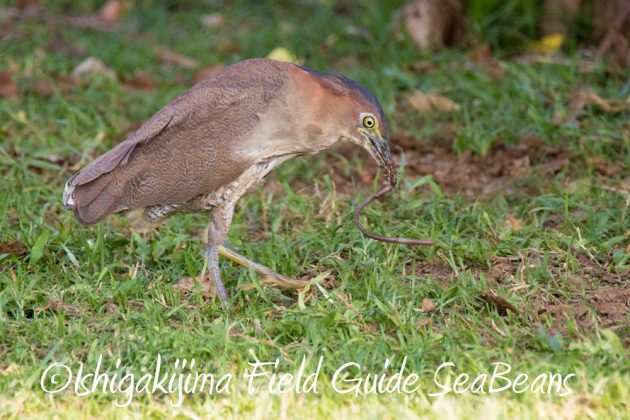 ズグロミゾゴイが大きなミミズを引っ張っていました。