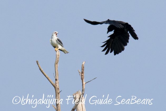 カタグロトビにちょっかいを出すオサハシブトガラス。