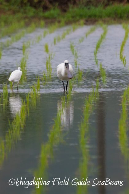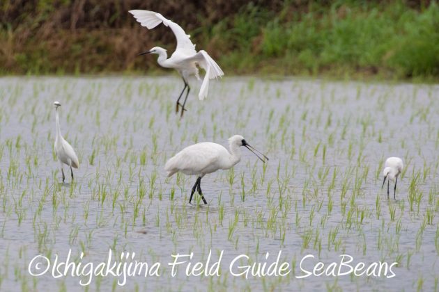 コサギの群れの中にクロツラヘラサギ1羽が居ました。
