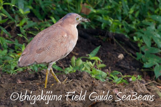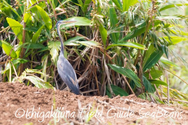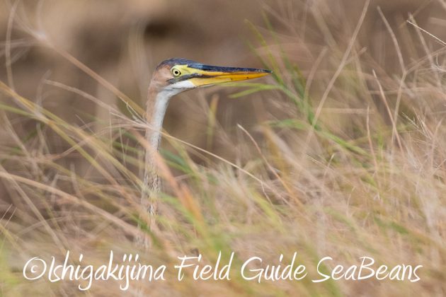 草むらから、こちらを覗き込むムラサキサギ幼鳥。