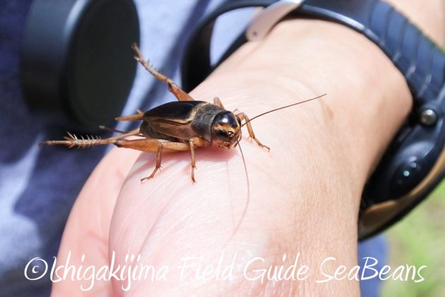 耕作地で両足を上げたままのフタボシコオロギを観察。