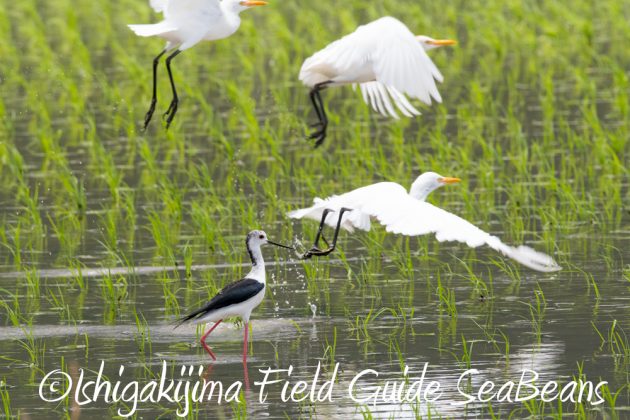 セイタカシギとアマサギ。