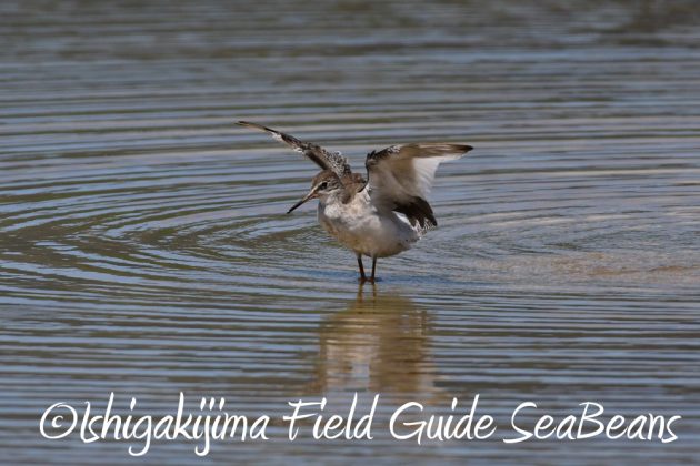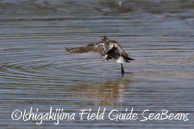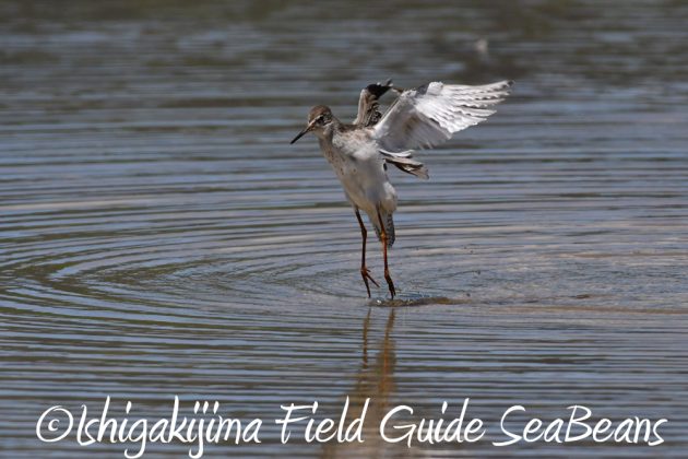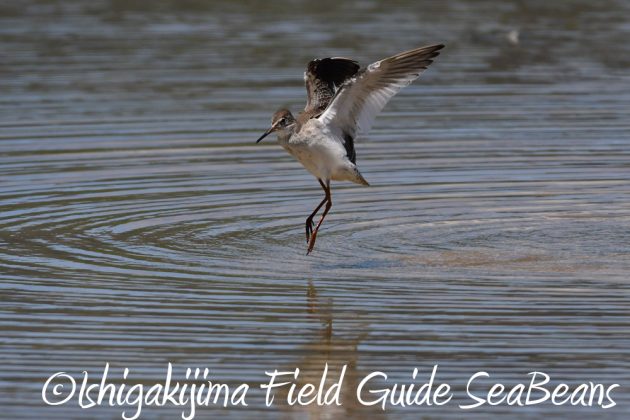 アカアシシギ、水浴び後の水落としの羽ばたき。