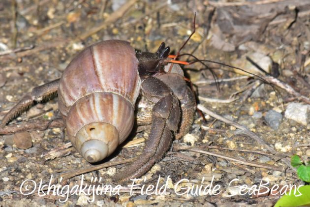 大きなアフリカマイマイの殻に入ったオカヤドカリの仲間。