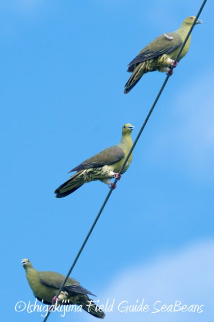 電線に十数羽のチュウダイズアカアオバトが止まっていました。