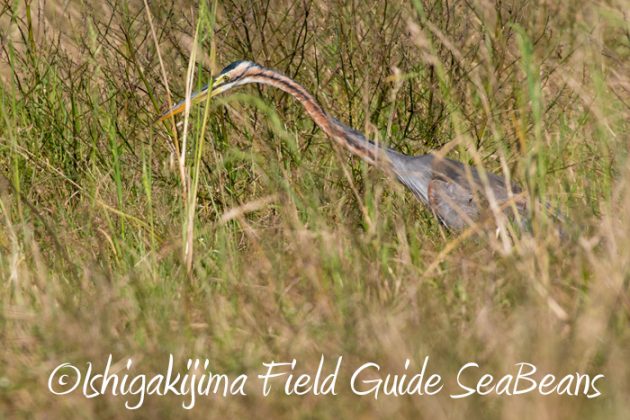 草むらの中をジッと睨むムラサキサギ。