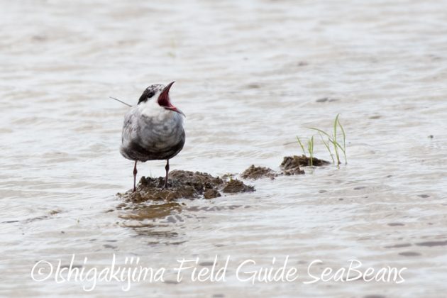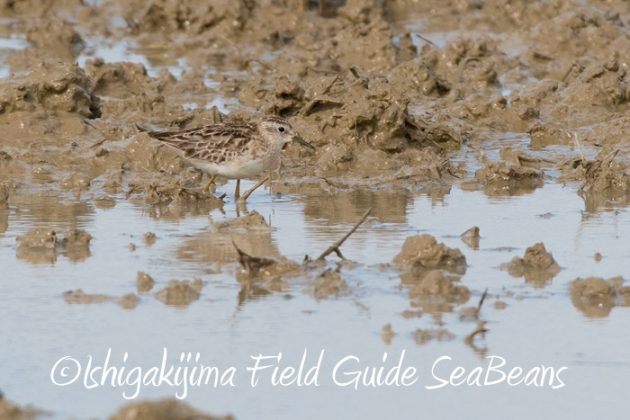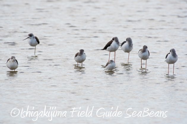 セイタカシギの群れの中に1羽のコアオアシシギ。