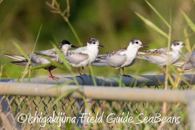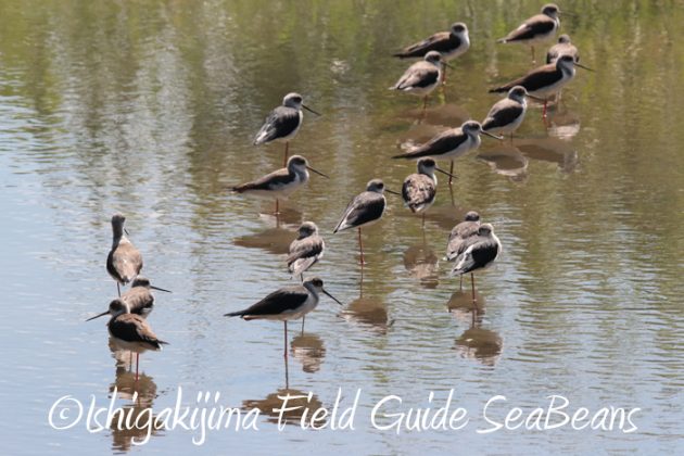 ムクドリの群れの中にホシムクドリ8羽とコムクドリ1羽を観察。