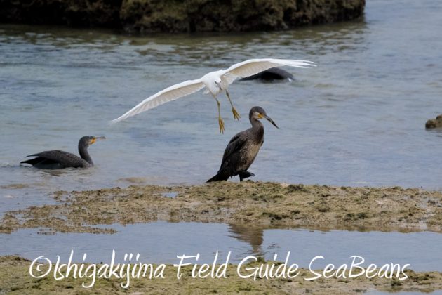 海岸の浅瀬に小魚が群れているようで、カワウ十数羽、クロサギ20羽、ダイサギ6羽、アオサギ数羽が競い合って魚を獲り合っていました。