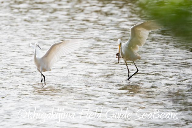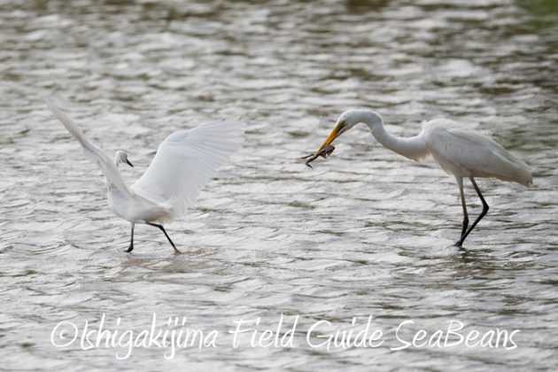 ダイサギがカエルを捕獲、横取りしようとコサギが纏わり付いていました。