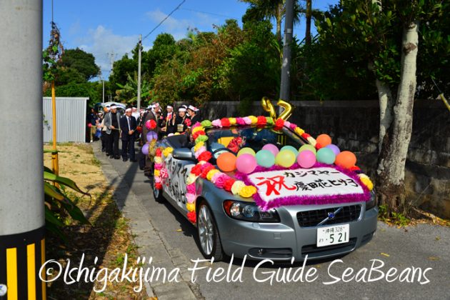 沖縄ではこの年齢になると子供にかえると言われることから、風車(カジマヤー)を持って集落内をオープンカー等でパレードする[2]。小さな離島では、学校の鼓笛隊が加わる等して島ぐるみで祝われることもある。
