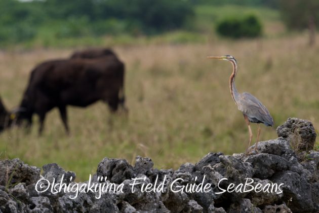 牛を見つめるムラサキサギ。