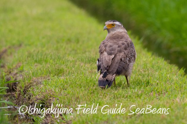 田んぼで餌探し中のカンムリワシ。