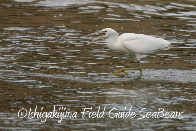 小魚を捕獲して飲み込もうとしているクロサギ白色型。