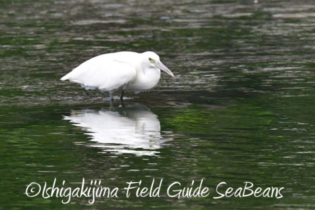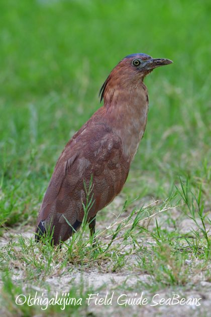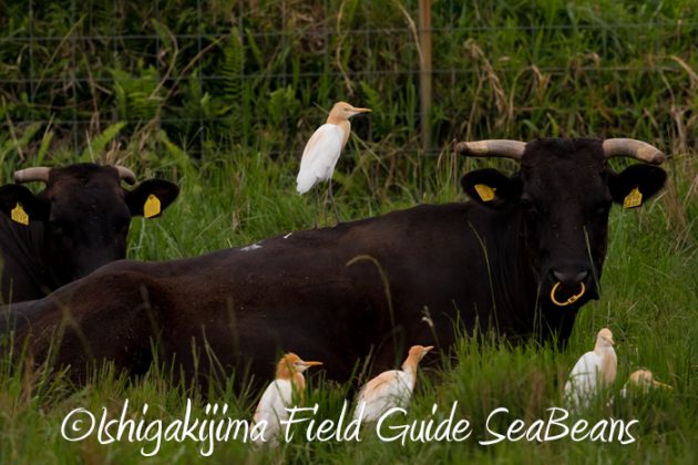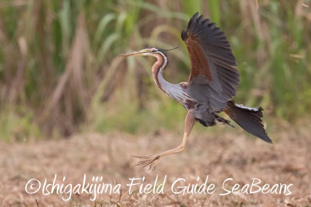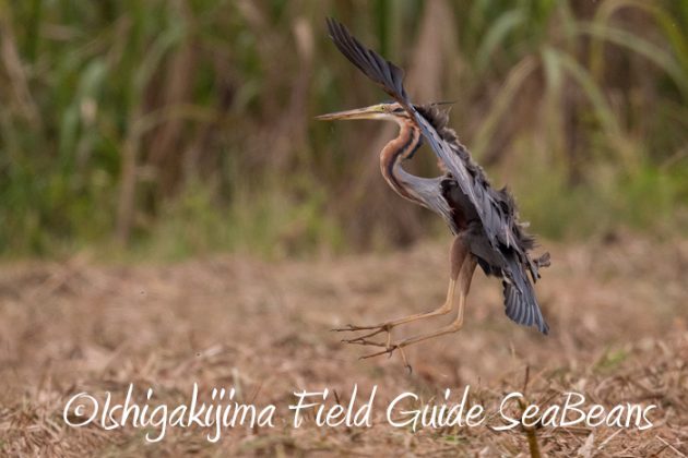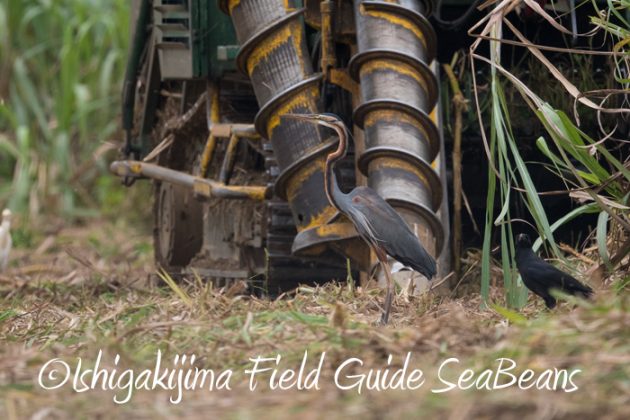 サトウキビ収穫中のハーベスターが迫ってくるのに余裕で佇むムラサキサギ。