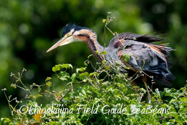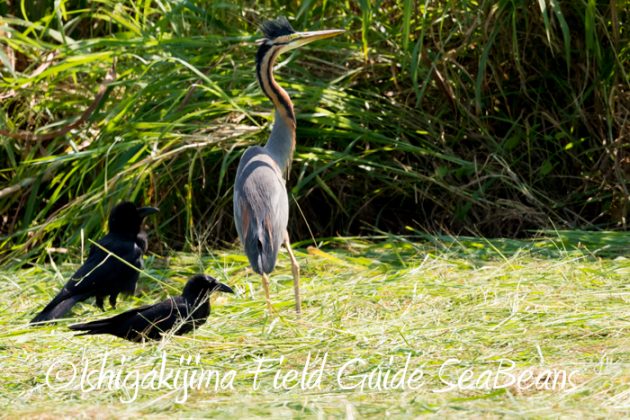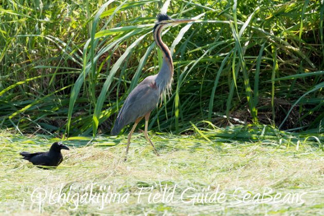 オサハシブトガラスにちょっかいを出されて怒っているムラサキサギ。