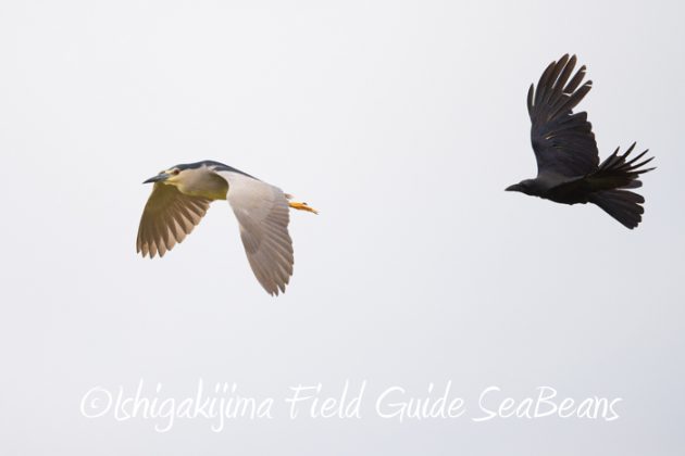 オサハシブトガラスと一緒に飛ぶゴイサギ。