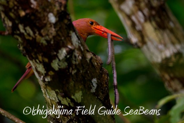 大きなミミズを捕獲したリュウキュウアカショウビン。