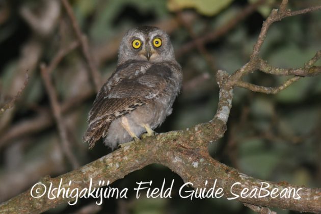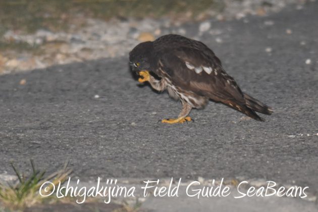 路上で餌を食べるリュウキュウアオバズク幼鳥。