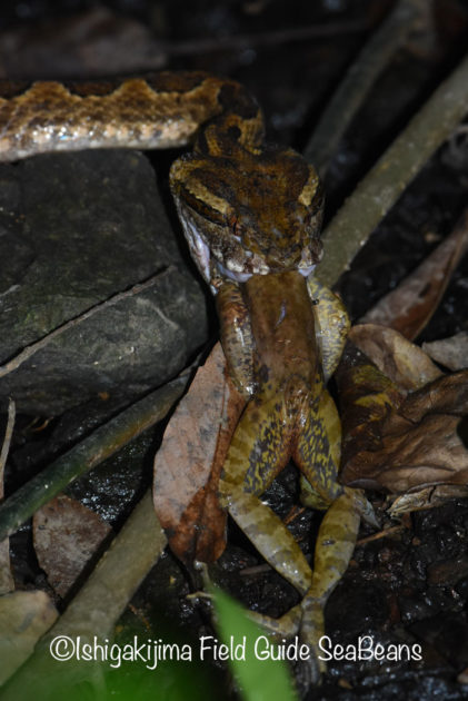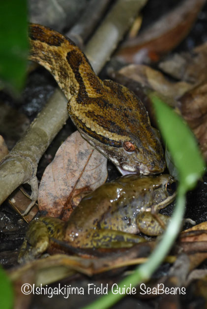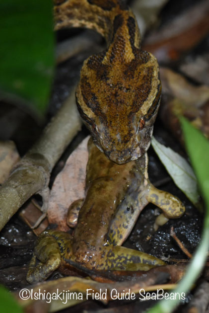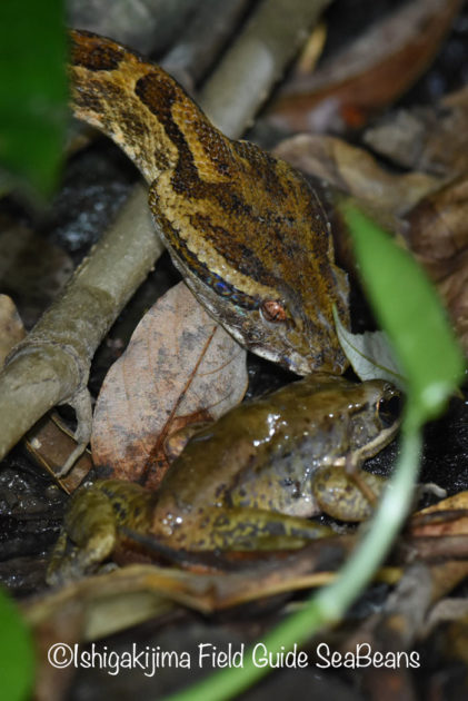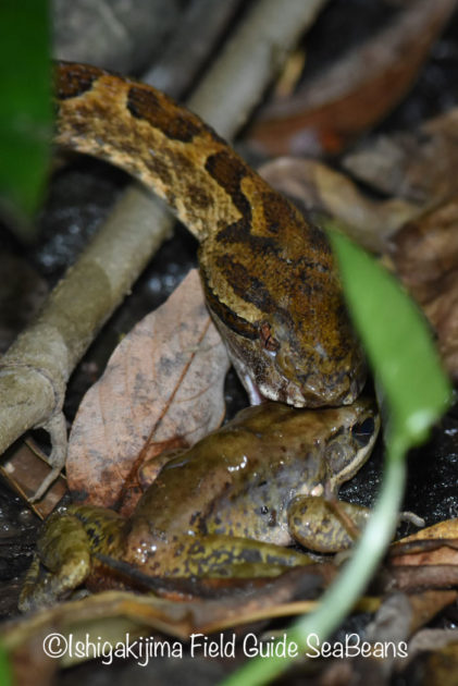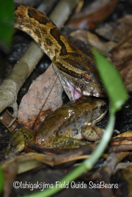 サキシマハブがジッとオオハナサキガエルを見つめていました!!