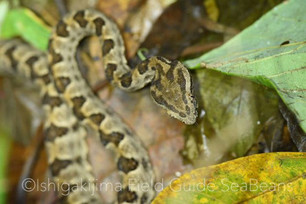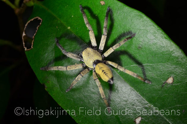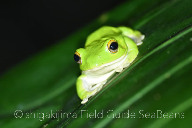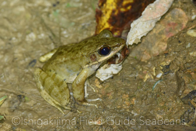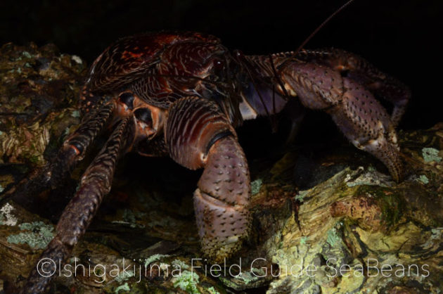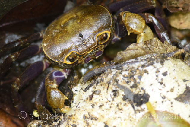 ヤエヤマアオガエルの卵を食べるヤエヤマヤマガニ。
