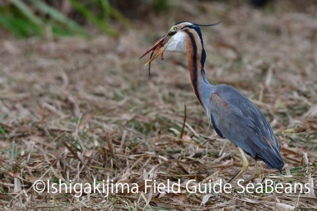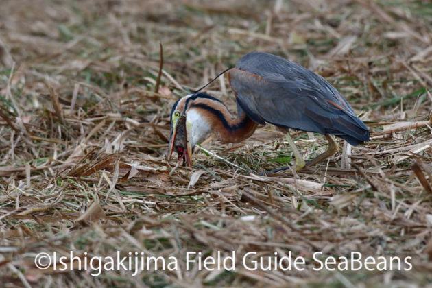 大きなネズミを捕獲して飲み込もうとするムラサキサギ。