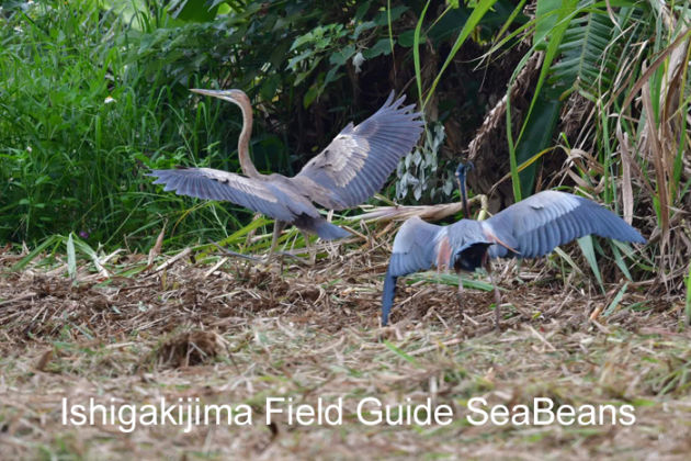 ムラサキサギ若を追い払うムラサキサギ成鳥。