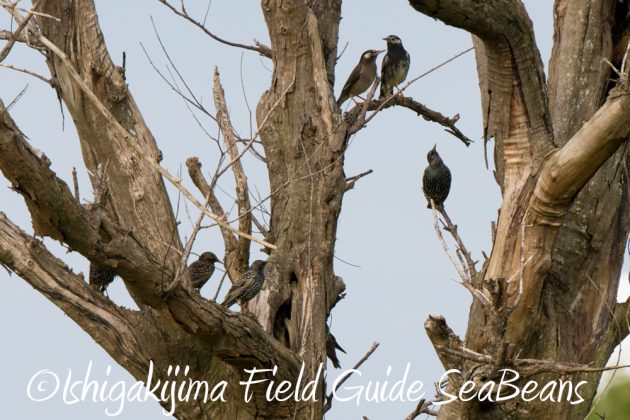 ムクドリとホシムクドリの混群。