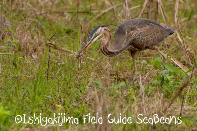 サキシマヌマガエルを捕獲したムラサキサギ若。