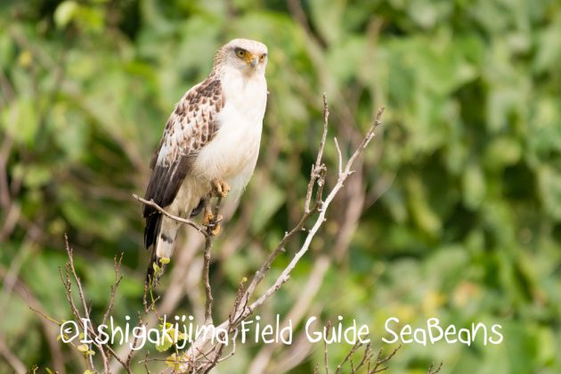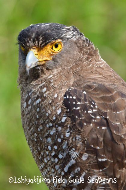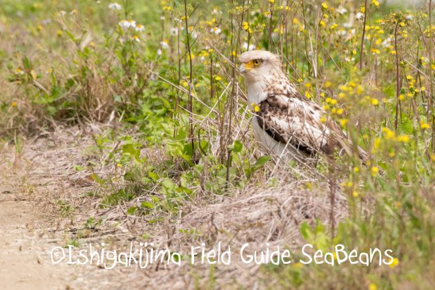 黄色が綺麗なオニタビラゴの中で佇むカンムリワシ幼鳥。