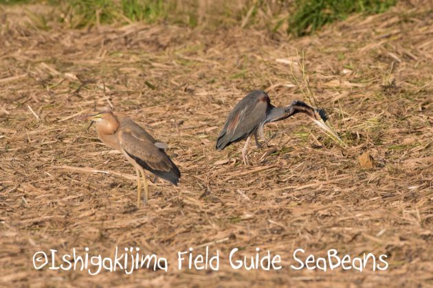 左がムラサキサギ若、右がムラサキサギ成鳥。
