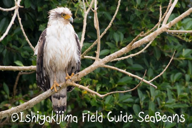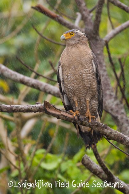 大雨の中、枝に止まっていたカンムリワシ雄成鳥。