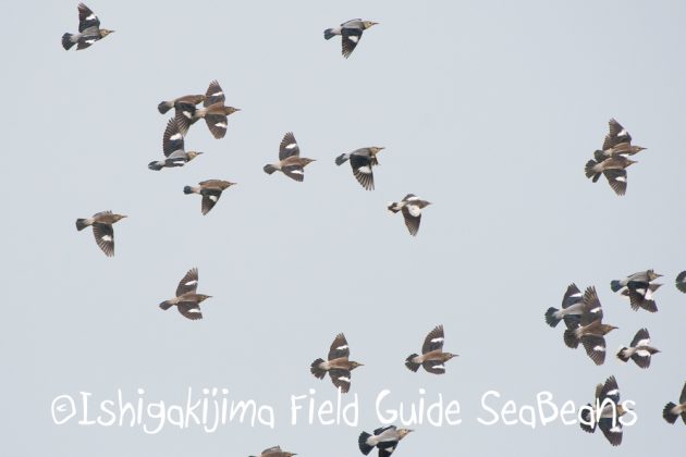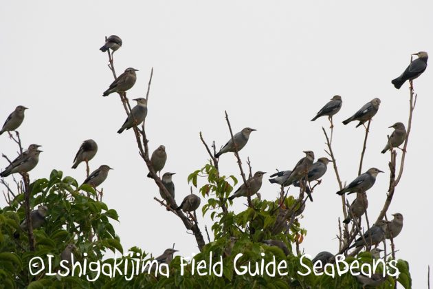 ギンムクドリの群れの中に数羽のカラムクドリも居ました。