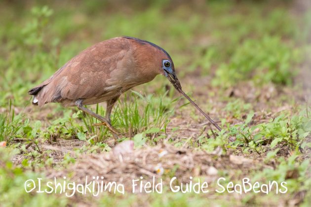 大きなミミズをひっばるズグロミゾゴイ雄成鳥。