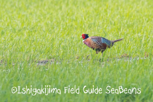 水田を歩くコウライキジ。
