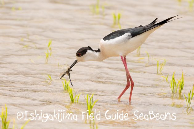 セイタカシギがトンボを捕獲。