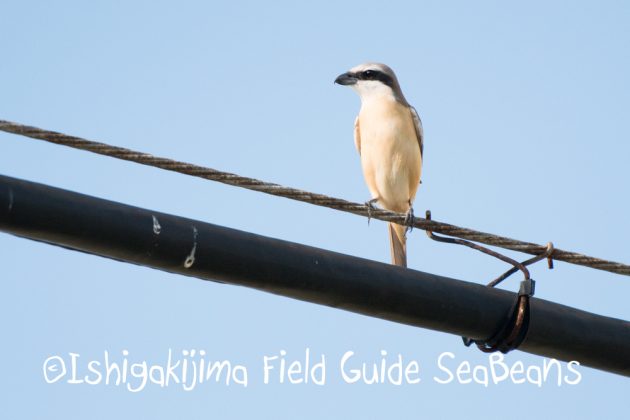電線にもシマアカモズ。
